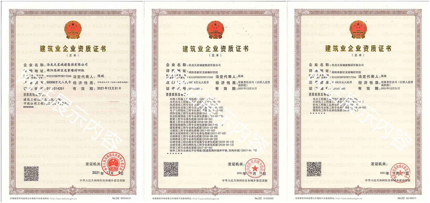 浩龍?zhí)煨浅墙瘓F(tuán)有限公司,2007年成立于“李白故鄉(xiāng)、中國科技城”—四川省綿陽市,企業(yè)注冊資本金5.0008億元。公司共有27項建筑業(yè)企業(yè)資質(zhì),其中國家一級資質(zhì)11項,二級資質(zhì)10項,三級資質(zhì)5項,特種資質(zhì)不分等級1項,類別涵蓋建筑、市政、水利、機(jī)電、隧道、起重設(shè)備安裝等基礎(chǔ)及未來發(fā)展重點專業(yè)。公司下設(shè)三個辦事處,業(yè)務(wù)范圍輻射全國,在建項目三十余個,累計完成產(chǎn)值超11億元。公司是綿陽市建筑施工企業(yè)協(xié)會副會長單位、綿陽遂寧商會會長級單位、綿陽首批建筑業(yè)綠卡企業(yè),在綿陽本地企業(yè)中綜合實力名列前茅。